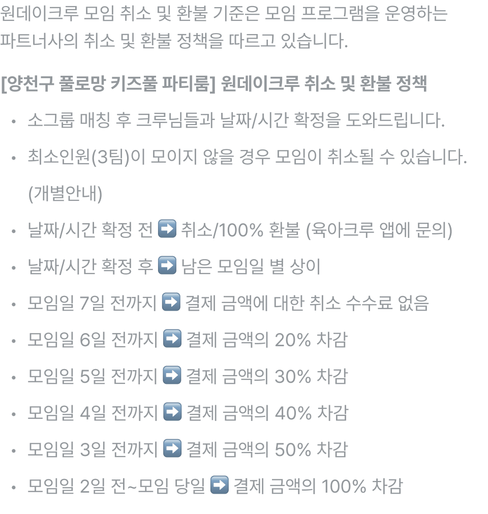 - 입금 확인 후, 육아 프로필과 가능한 시간대를 고려하여 소그룹 매칭이 진행됩니다.