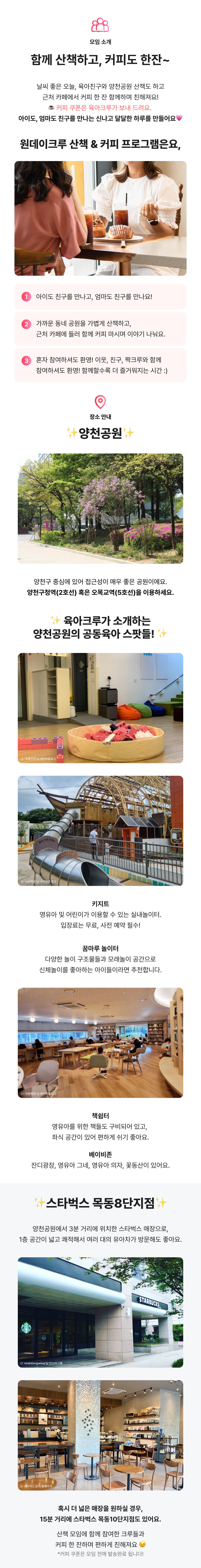 물론 더 오래 산책하셔도 좋고, 함께 키즈카페에 가셔도 좋고, 모두 크루님들의 자유랍니다. ☕