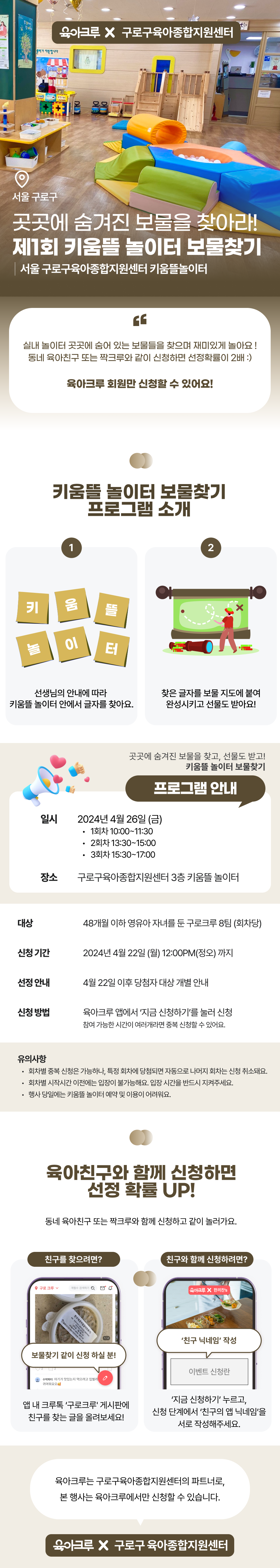 💡 Tip! 육아크루 앱 > '크루톡 구로크루' 게시판에서 함께 이벤트에 신청할 친구를 구할 수 있어요! (크루톡에 글을 남겨 함께 신청할 친구를 찾아보세요.)