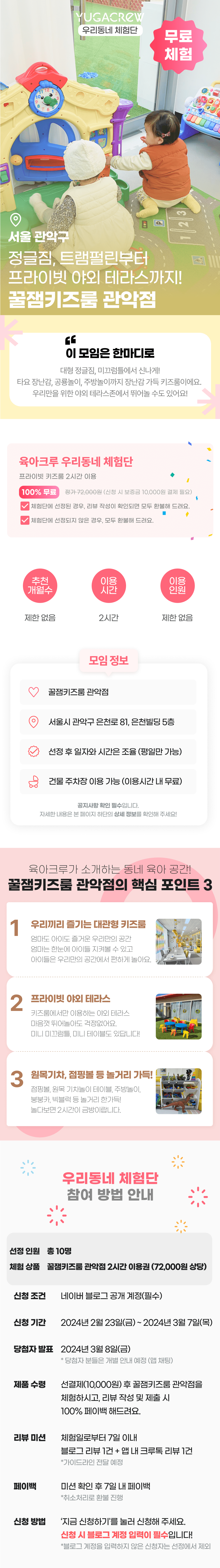 - 육아크루, 원데이크루를 통해 <꿀잼키즈룸 관악점>에 갔다는 내용을 포함해주세요.