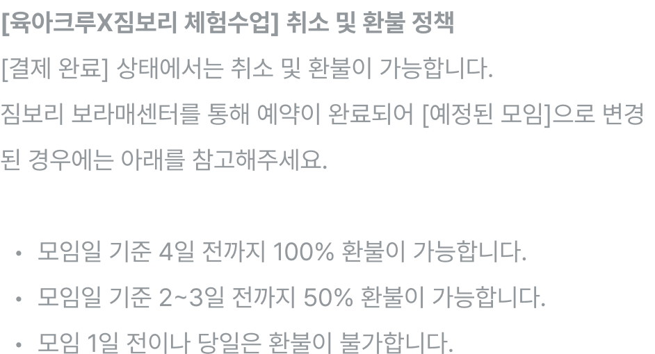 - 모임일 4일 전까지 취소 가능하며, 자세한 내용은 [안내사항] 취소 및 환불 정책을 참고해 주세요.