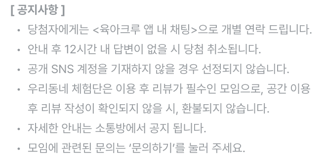 - 후기 업로드 후 [문의하기] 버튼 혹은 [육클이2호 1:1 채팅방] 을 통해 링크를 보내주세요.