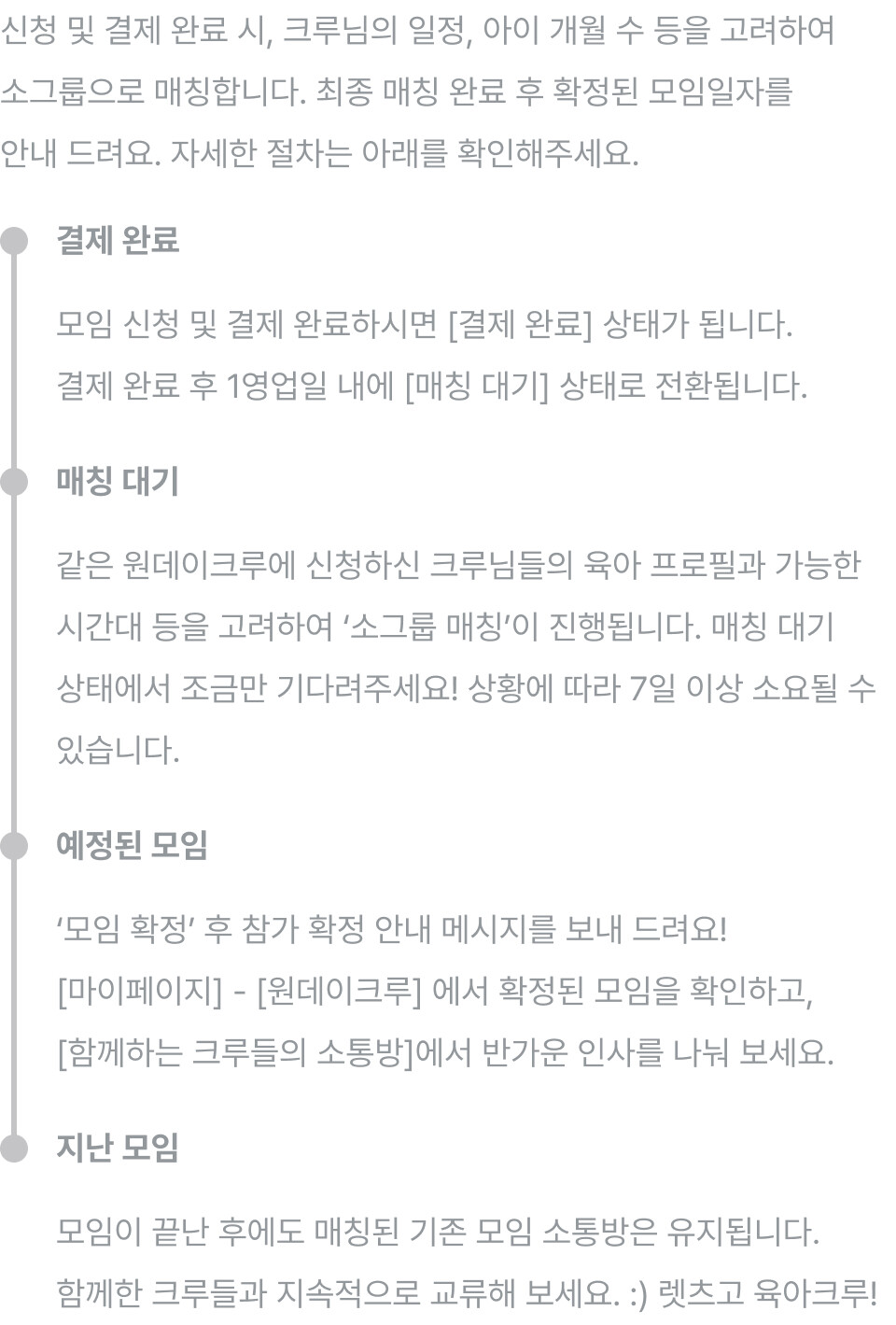 - 모임비 결제 완료 후, 영업일 기준 1일 내 예약이 확정되고 소그룹 매칭이 진행됩니다.