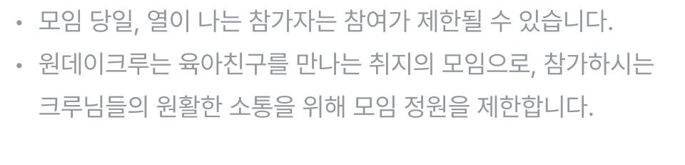 - 모임일 2일 전까지 취소 가능하며, 자세한 내용은 [안내사항] 취소 및 환불 정책을 참고해주세요.