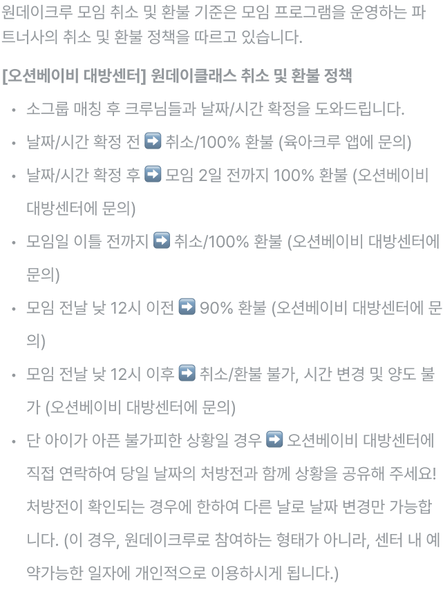 - 소그룹 매칭 후 선호하시는 시간에 맞추어 상세 시간을 조율해 드려요. 모임일 2일 전까지 100% 환불 가능합니다. (모임일 전날 낮 12시 이후는 환불 불가, 아이가 아픈 경우 등은 다른 날로 예약 변경 가능, 상세 내용은 취소/환불 정책 참고
