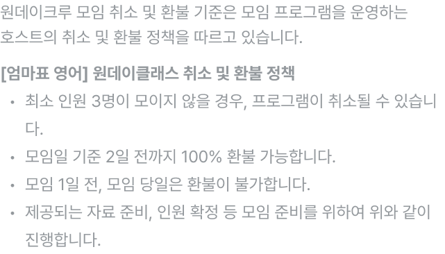 - 모임일 2일 전까지 취소 가능하며, 자세한 내용은 [안내사항] 취소 및 환불 정책을 참고해주세요.
