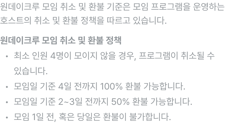 - 모임비 결제 완료 후, 영업일 기준 1일 내 예약이 확정되고 소그룹 매칭이 진행됩니다.