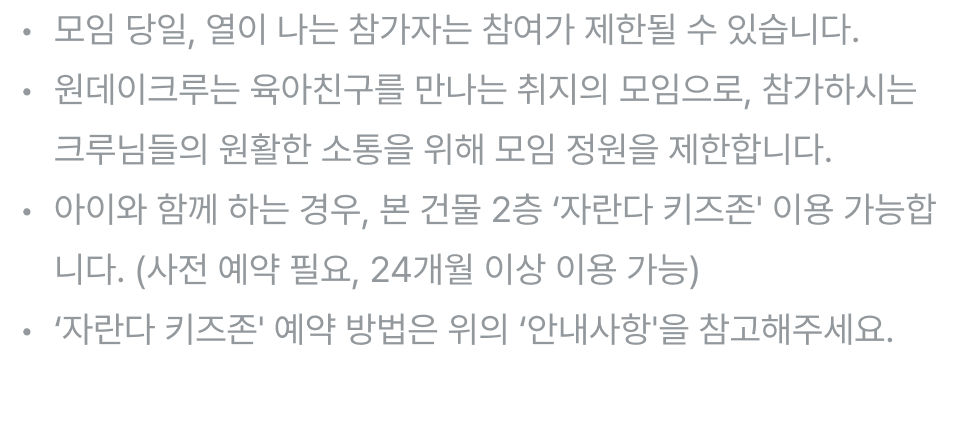 - 모임 특성 상 모여있는 분들의 사례와 대화를 중심으로 진행됩니다. 늦지 않게 참석 부탁드립니다.