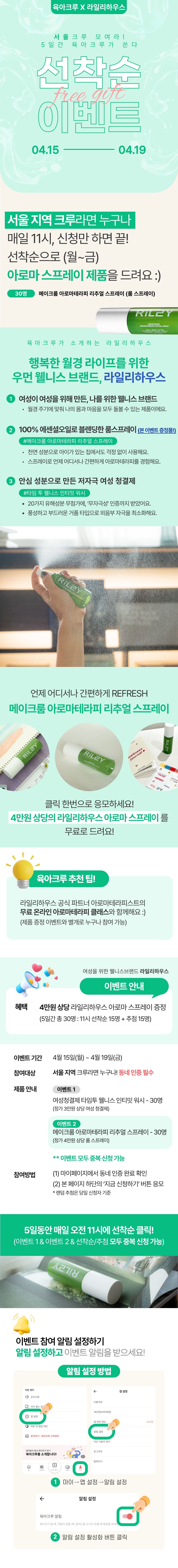✅ 선정 인원 : 총 30명에게 4만원 상당의 라일리하우스 아로마 스프레이 제품을 무료로 드려요.