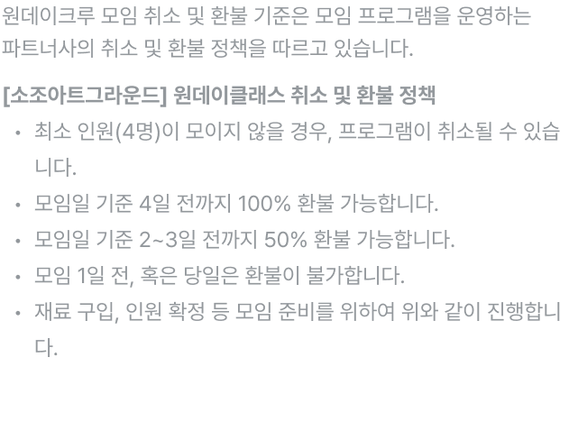 - 모임일 2일 전까지 취소 가능하며, 자세한 내용은 [안내사항] 취소 및 환불 정책을 참고해 주세요.