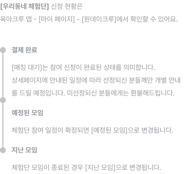 - 원데이크루 SNS 후기 1개 & 앱 내 크루톡에 후기 1개 각각 작성 필수 (참석일 이후 1주일 내)