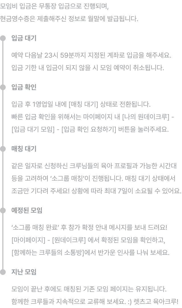 크루님들의 원활한 소통을 위해 엄마 1명+아이 1명으로만 신청을 받고 있습니다.